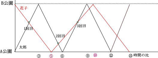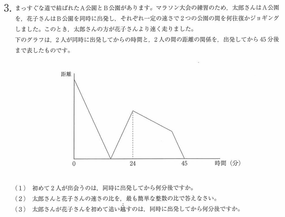 (3) 太郎さんが花子さんを初めて追い越すのは、同時に出発してから何分後ですか。 解説解答 横軸に時間の比 縦軸にA公園とB公園の間の距離のグラフをかくと上の通り。 3回目は太郎さんが花子さんを初めて追い越すとき。 このとき太郎さんは花子さんよりAB間を長く歩いている。 太郎さんは AB間を速さ⑤で24分間で歩いたので、AB間の距離を 5×24 = 120とする。 太郎さんは花子さんよりAB間120長く進むのにかかる時間は 120 ÷ (5 - 3) = 60 答え 60分後