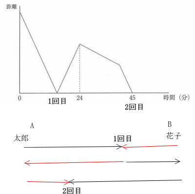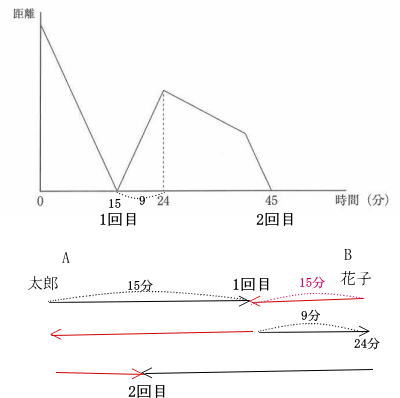 (1) 初めて2人で出会うのは、同時に出発してから何分後ですか。 解説解答 グラフより 2人が2回目に出会ったのは、出発して45分後。 45分間に2人でAB間の3倍の距離を歩いている。 よって1回目に出会ったのは 出発して 45÷3 = 15分後 答え 15分後
