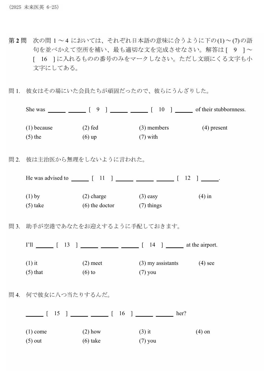 2024年度未来枠一次試験英語問題は1.適語選択 2.整序英作文 3.~6.長文総合問題が出題されました。