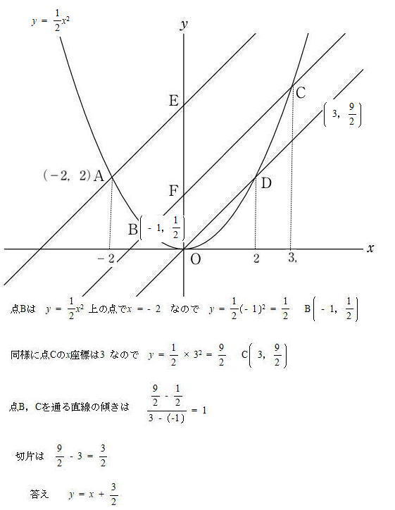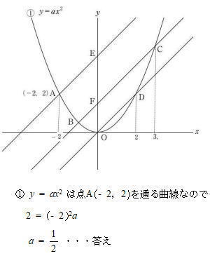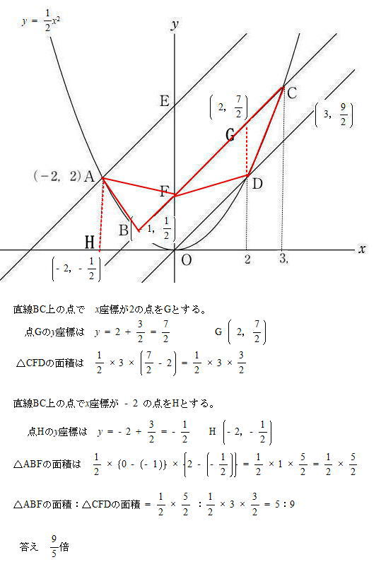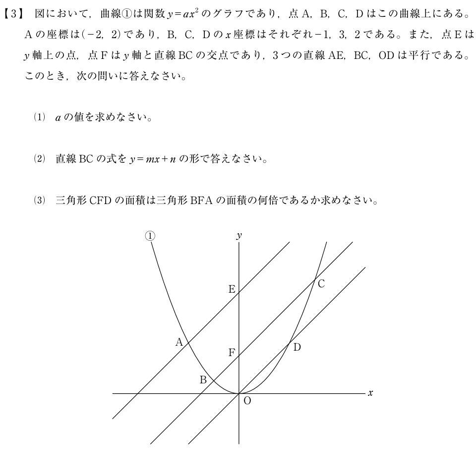 (2) 直線BCの式を y = mx + n の形で答えなさい。 解説解答 中央大学附属横浜高校2020年度数学入試問題3.関数 (2)解説解答 (3) 三角形CFDの面積は三角形BFAの面積の何倍であるか求めなさい。 解説解答