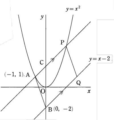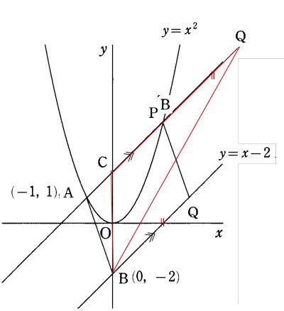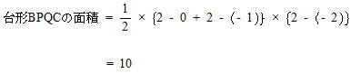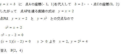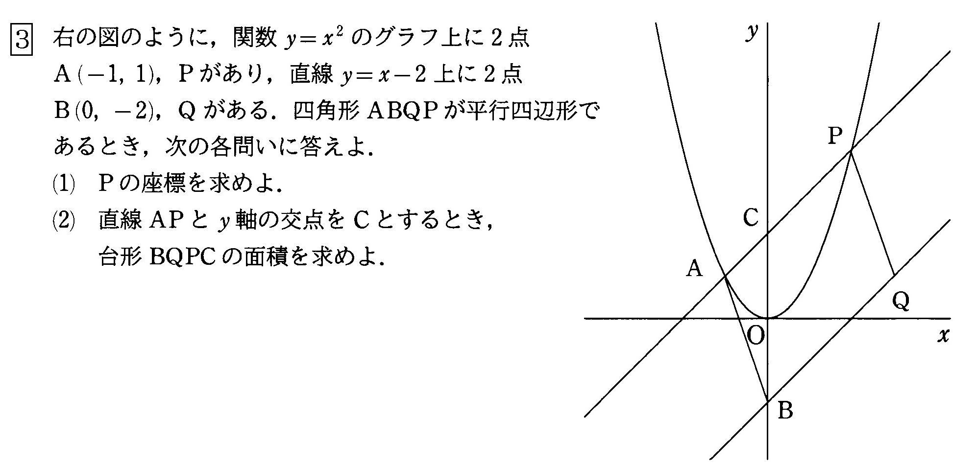 (2) 直線APとy軸の交点をCとするとき、台形BPQCの面積を求めよ。 解説解答 台形BPQCの面積 = △CBPの面積 + △PBQの面積 △CBPと△PBQは高さの等しい三角形。平行四辺形の性質より BQ = APなので、CP + BQ = CP + AP 答え 10