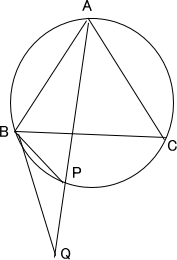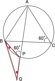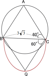 図のように,半径3 の円に正三角形ABCが内接している。点P は∠A に対する弧BC上を点B から点C まで動く。 いま,BP = PQ となるようにAP の延長上に点Qをとるとき,次の問いに答えなさい。 (1) 辺BC の長さを求めなさい。 (2) ∠ BQP の大きさを求めなさい。 (3) 点P がBからCまで動くあいだに,点Q が動いた道のりを求めなさい。