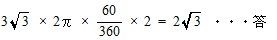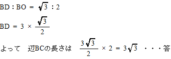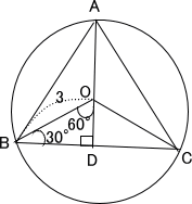 (1) 辺BC の長さを求めなさい。 解説解答 図のように円の中心Oと点A,B,Cを結ぶ。Oから辺BCに垂線を下ろし交点をDとする。 ∠BOC = ∠AOB = ∠AOC = 360÷3 = 120° ∠BOD = 120 ÷ 2 = 60° よって三角形BODはそれぞれの角度を30°,60°とする直角三角形。
