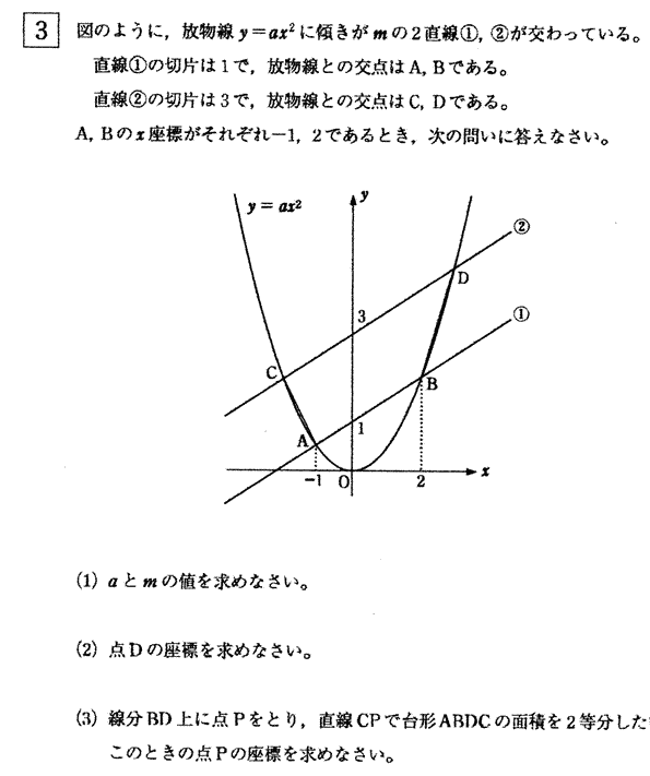今回は2.座標とグラフを解説します。(3)は等積変形を必要とする問題です。平面図形の等積変形は私立高校入試問題では頻出です。基本的な考え方を確認しましょう。