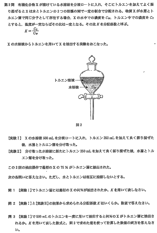 今回は2020年度順天堂大学医学部化学入試問題から溶液の分配平衡の問題を解説します。