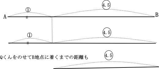 線分図より P君をB地点でおろして引き返し、Q君を乗せてB地点に着くまでに進んだ距離は