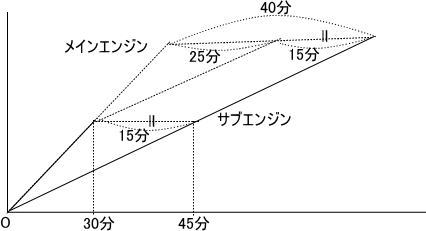 もし,メインエンジンを修理せず,故障してすぐにサブエンジン のみに切りかえていれば,予定よりも25分おくれるだけですみました。