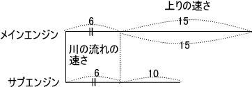 5. ボートを使って川下のA地点から川上のB地点に向かいます。ボートにはメインエンジンとサブエンジンがついていますが,メインエンジンのみでA地点からB地点に 向かう予定でした。