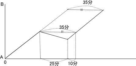 修理に25分かかった後, 再びメインエンジンのみでB地点に向けて動き出したところ,予定より35分おくれて B地点に到 着しました。