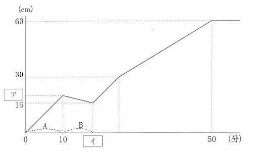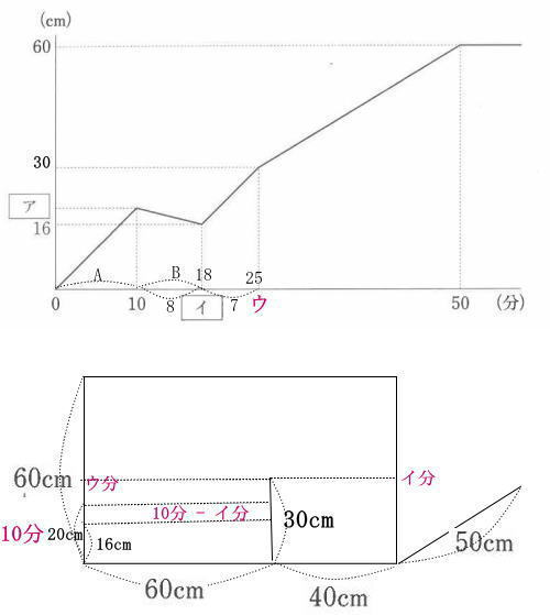 イからウまでの時間は、B部分に水を入れ始めて しきりの高さ30cmになりAの部分に水が入りAB両方の高さが30cmになる時間。よって水はB部分からあふれA部分の水面の高さのみが上がる。