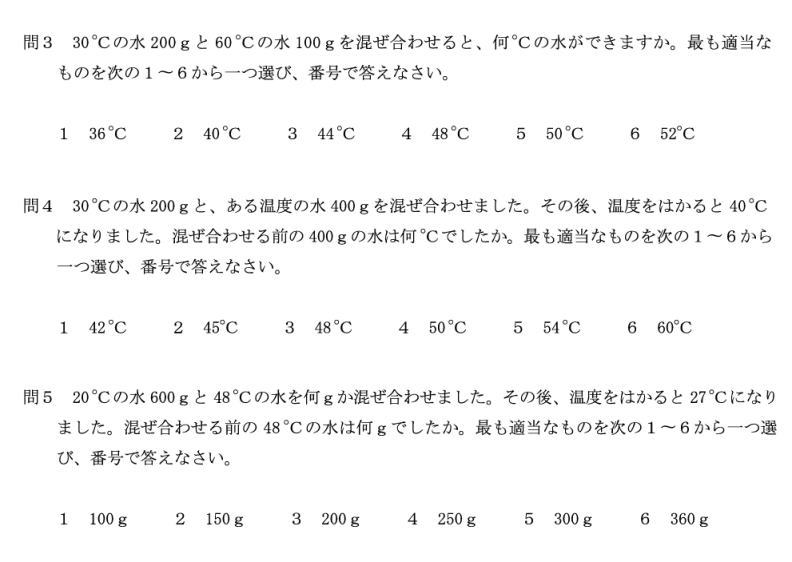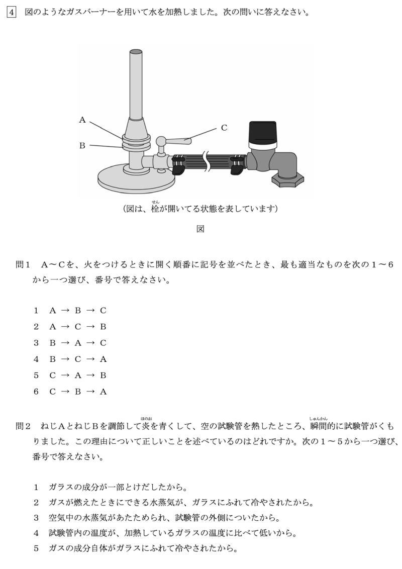4. ガスバーナーを正しい手順で使用できるかに加えて、温度の異なる水を混ぜ合わせると両方の温度が同じになるが、熱の移動によってその温度が計算できるかを問うようした。問1は必ず知っておいてほしい。問2は難易度が上がるが正しくないものを消去すれば答が選べる。問3は着実に点をとってほしい。問4と問5は問題をよく読めば、
