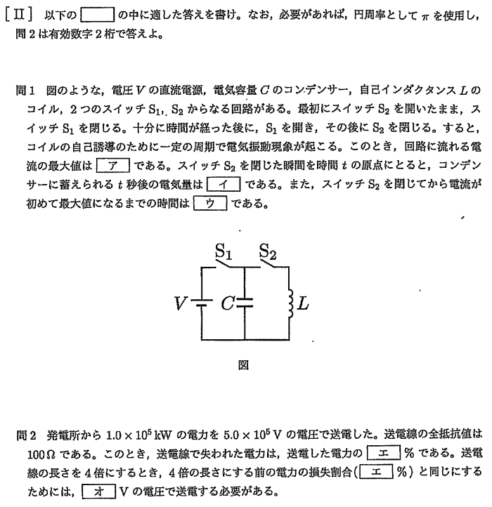 問1は電気の交流の振動回路の問題です。エネルギー保存則などを用いる標準問題です。問2は交流の送電の問題です。解き方のパターン覚えておきましょう。