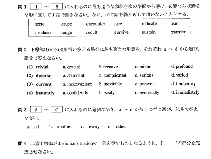 | 問1 [1]~[6]に入れるのに最も適当な同士を次の語群から選び、必要ならば適切な形に直して1語で書きなさい。なお、同じ語を繰り返して用いないこととする。 arise cause encounter face indicate lead produce range result survive sustain transfer |