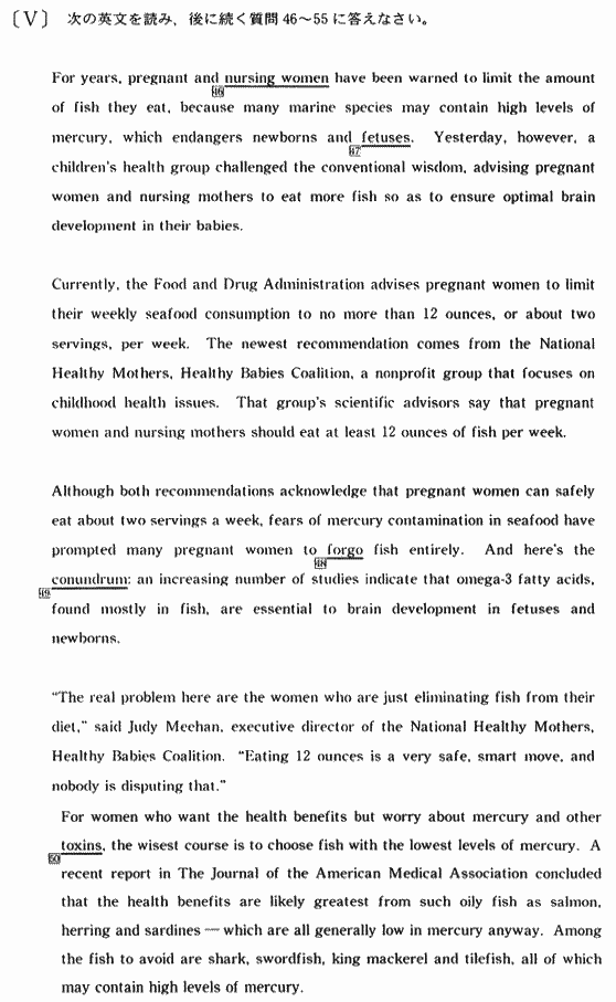 妊娠中や授乳期の女性の魚介類の摂取による胎児や乳児への健康被害、よりよい魚介類の食べ方についてが東邦大学医学部英語入試問題Ⅴのテーマです。
