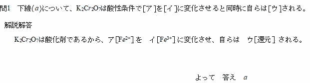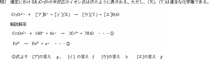 今回は酸化還元の問題です。問2の①式は書けるようにしておきましょう。問3では③式を立てたあと理論上のモル比と実験上のモル比を等号で結んで計算します。標準的な問題です。